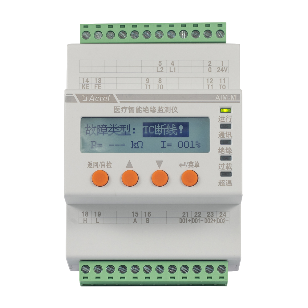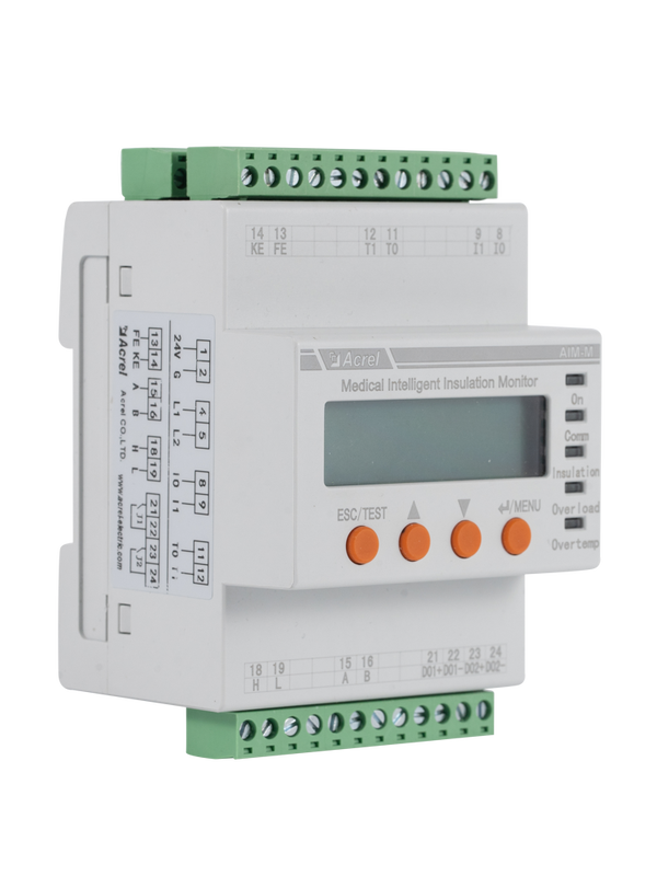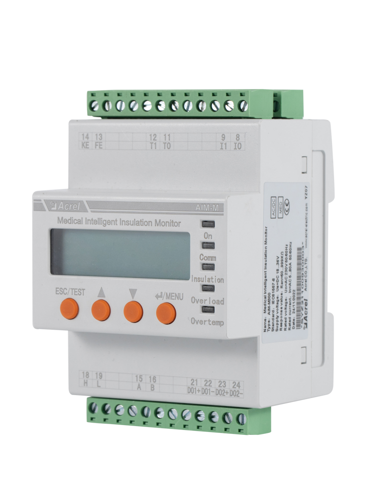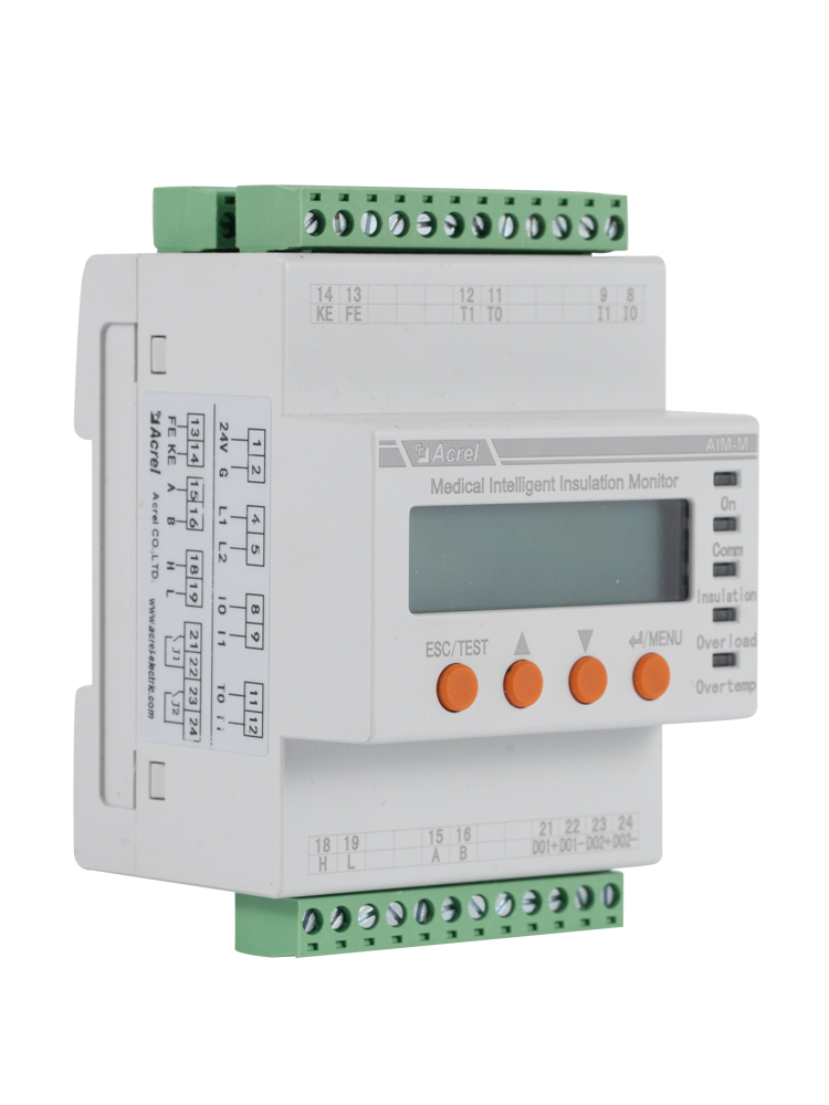 The AIM-M300 medical intelligent insulation monitor the insulation resistance of medical IT system, At the same time, the load current and temperature of the IT system transformer is monitored. In combination with ASG100, AIL100 series insulation fault locators and the appropriate measuring current transformers, the AIM-M300 is designed to support insulation fault location.AIM-M300 series medical intelligent monitoring device adopts advanced microcontroller technology, which has high integration, compact size, convenient installation and integrates intelligence, digitalization and networking in one. It is suitable for insulation monitoring of isolation power system in Class 2 medical locations such as operating room and intensive care unit.
